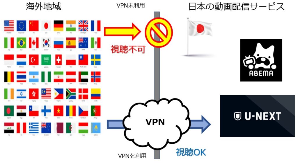 そこで、VPNを使うと、海外にいても日本のVPNサーバーを経由することで、日本の動画配信サービスを視聴できます。